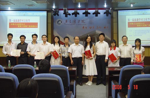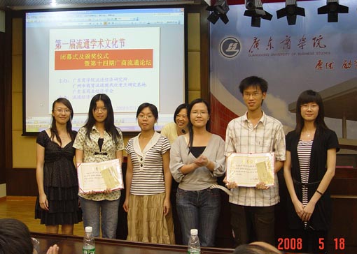 2008年5月18日下午,广东商学院第一届流通学术文化节颁奖仪式及闭幕式暨第14期广商流通论坛在实验楼210会议室举行。雍和明副校长、流通所负责人王先庆教授、广州市商道咨询有限公司总经理李志坚研究员等领导和嘉宾共100余人出席颁奖仪式及闭幕式。