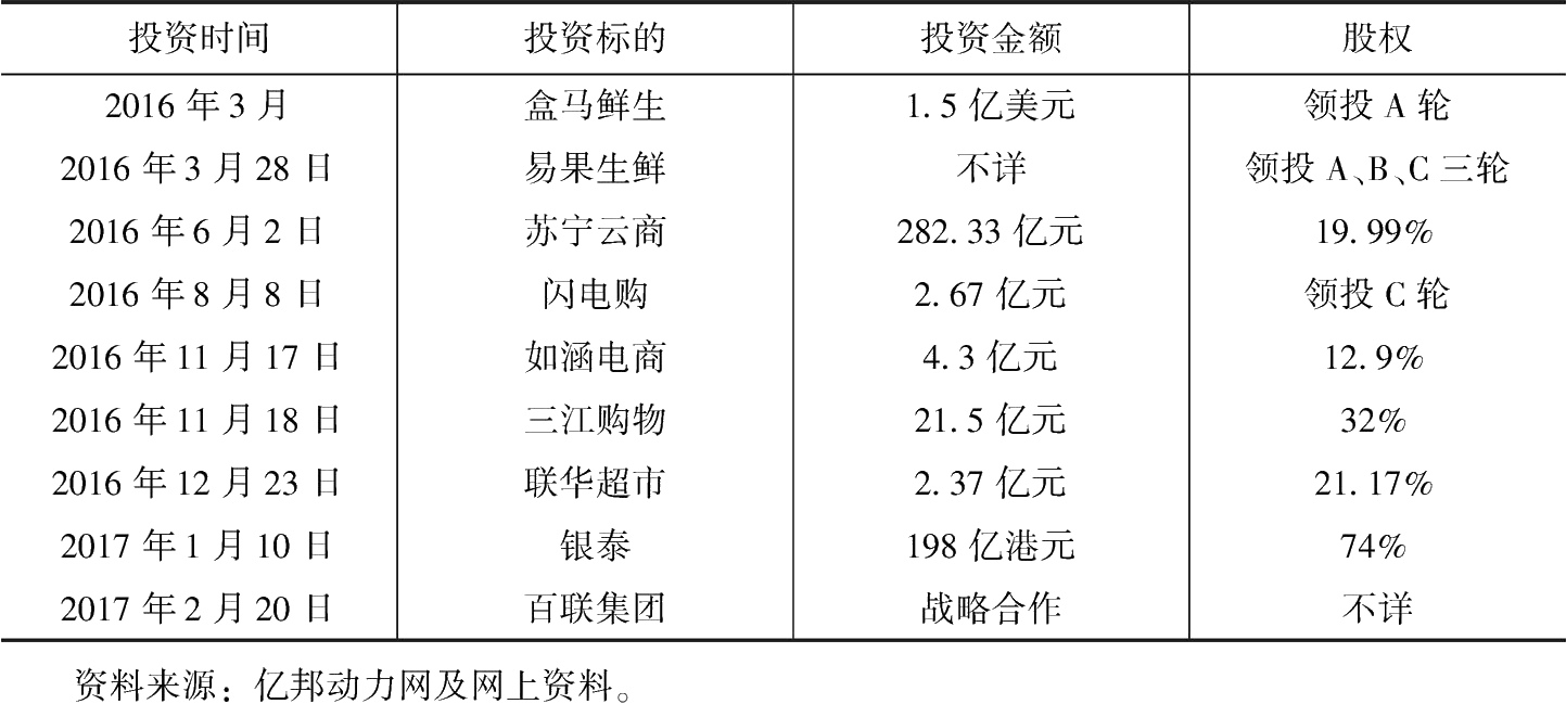 表1 阿里巴巴集团近1年投资线上线下的零售项目