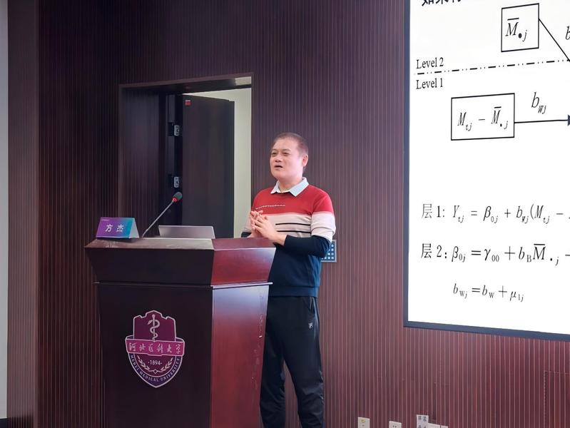 2025年9月27-28日,广东财经大学方杰教授受邀参加河北医科大学融合与赋能卫生管理&人文照护协同创新前沿论坛,做了题为“基于动态结构方程模型的生态瞬时评估数据分析”的主旨报告。