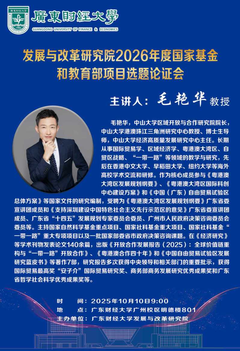 毛艳华教授将结合国家战略需求(如粤港澳大湾区、“一带一路”等),指导项目选题方向、论证逻辑及政策结合策略,助力提升申报质量。
