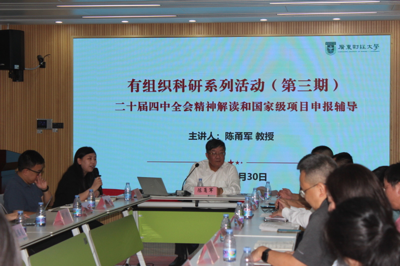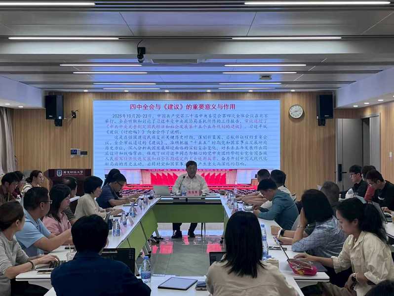 2025年10月30日下午,学校科研部举办二十届四中全会精神解读及国家级项目申报辅导会,特别邀请了我院特聘教授、国家社科基金重大项目首席专家陈甬军教授专题讲授。学校科研部副部长曾志辉、崔晓莹,学校各教学科研单位科研负责人、科研骨干共计70余人参加了此次辅导会。