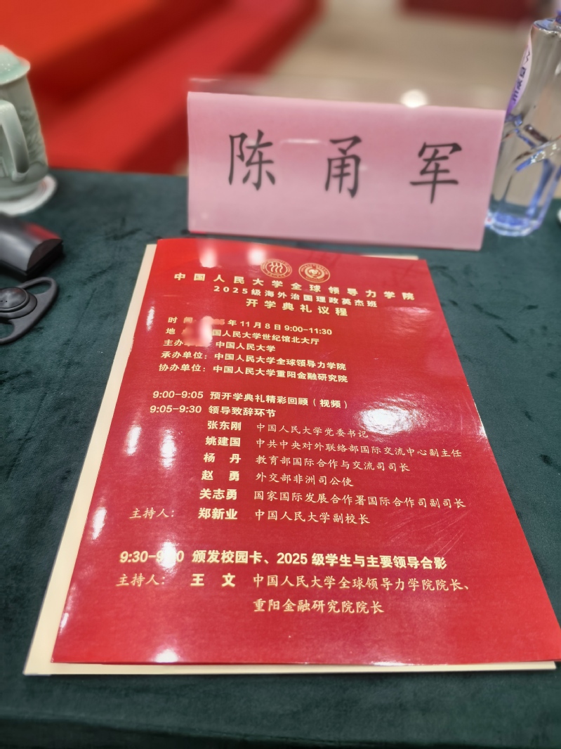 2025年11月8日,中国人民大学全球领导力学院2025级海外治国理政英杰班开学典礼在京举行。本次开学典礼由中国人民大学主办,中国人民大学全球领导力学院承办,中国人民大学重阳金融研究院协办。中国人民大学全球领导力学院首批新生首次来华参加开学典礼。该批新生均来自南部非洲执政党政治精英,在其政府部门担任重要职务,是各国领导层的核心后备力量。