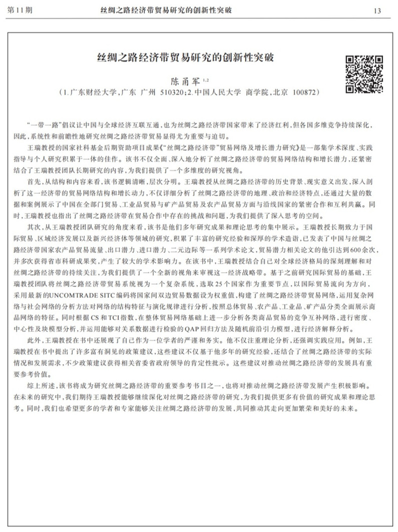 陈甬军:丝绸之路经济带贸易研究的创新性突破(浙江大学学报人文版)