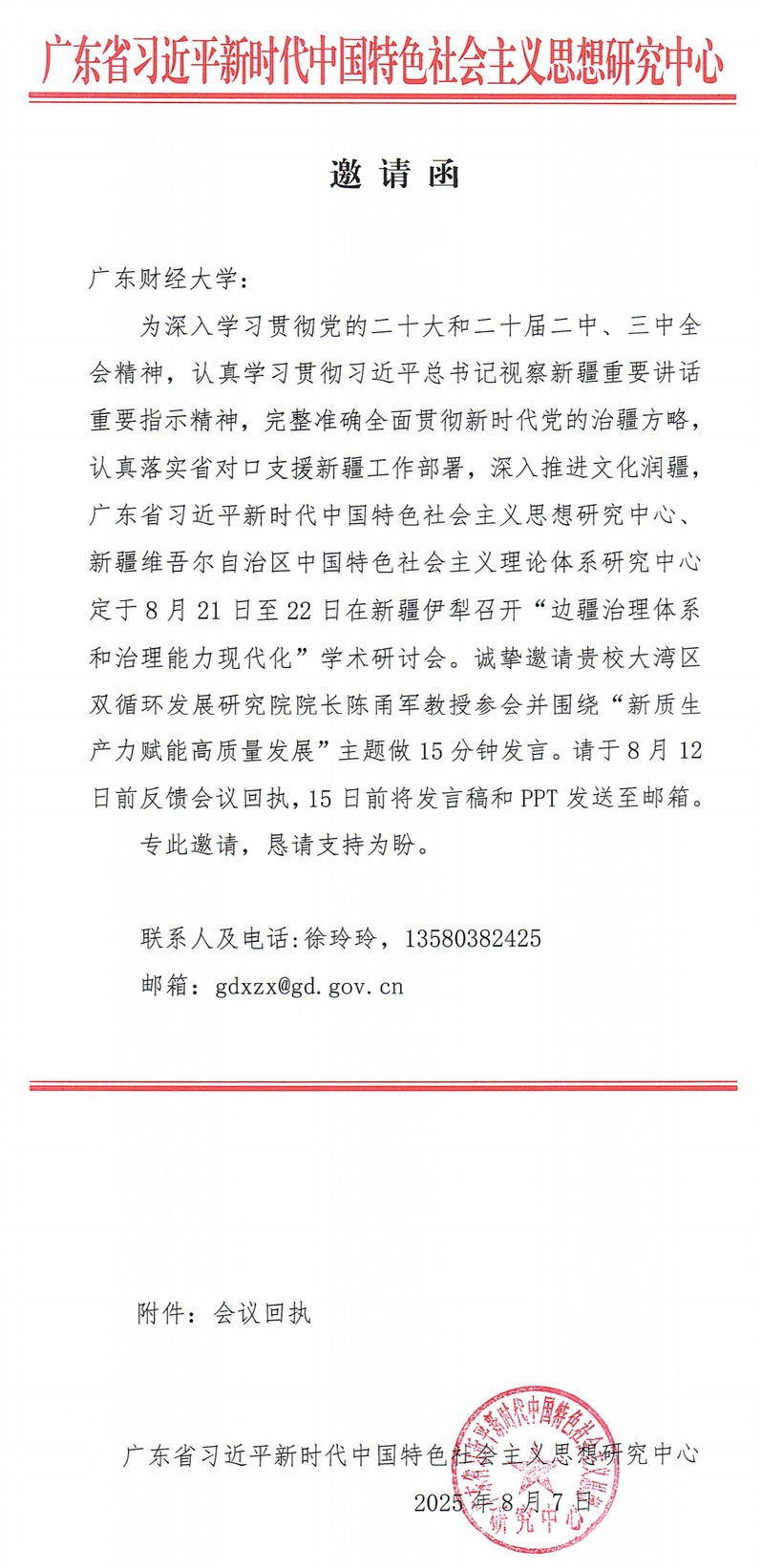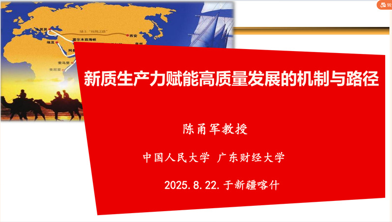 2025年8月21—22日,由广东省习近平中国特色社会主义思想研究中心和新疆维吾尔自治区中国特色社会主义理论体系研究中心联合举办的“边疆治理体系和治理能力现代化”研讨会在新疆伊犁州伊宁市伊宁宾馆举行,广东财经大学特聘教授陈甬军应邀与会,并作了新质生产力赋能高质量发展的主题发言。广东、新疆有关单位及承办单位伊犁州师范大学的有关领导、专家和师生代表一百余人参加论坛发言及研讨活动。