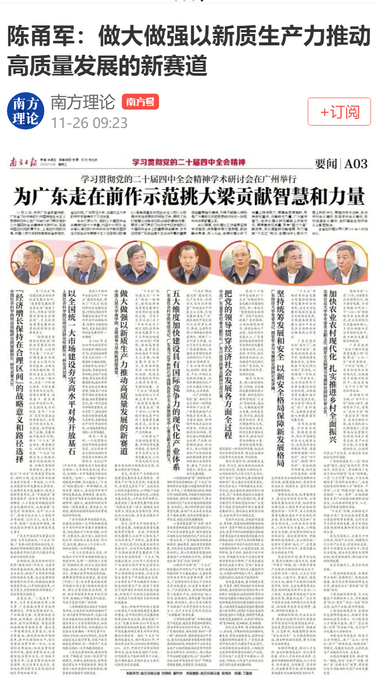 2025年11月25日,中共广东省委宣传部、广东省习近平新时代中国特色社会主义思想研究中心在广州珠岛宾馆举办学习贯彻党的二十届四中全会精神学术研讨会。广东财经大学发展与改革研究院特聘教授陈甬军应邀与会并作了《以新质生产力推动高质量发展--开辟“十五五”时期中国经济发展新赛道》的发言交流。省委宣传部领导主持研讨会,全省社科界有关专家学者一百余人参加研讨论会。