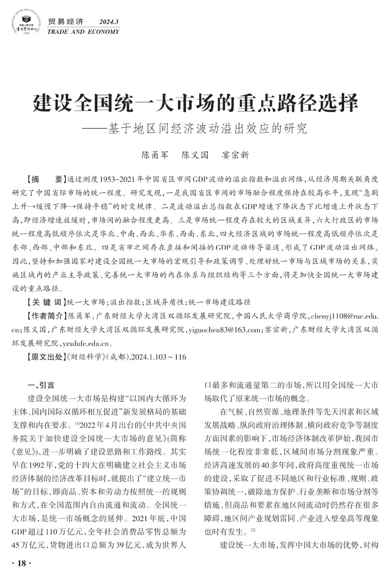 4. 陈甬军,陈义国,晏宗新:建设全国统一大市场的重点路径选择——基于地区间经济波动溢出效应的研究,原载于《财经科学(西南财经大学学报)》,转载于2024年《贸易经济》专题03期。
