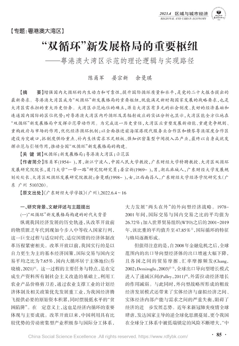2. 陈甬军,晏宗新,余曼琪:“双循环”新发展格局的重要枢纽——粤港澳大湾区示范的理论逻辑与实现路径,原载于《广东财经大学学报》,转载于2023年《区域与城市经济》专题04期。