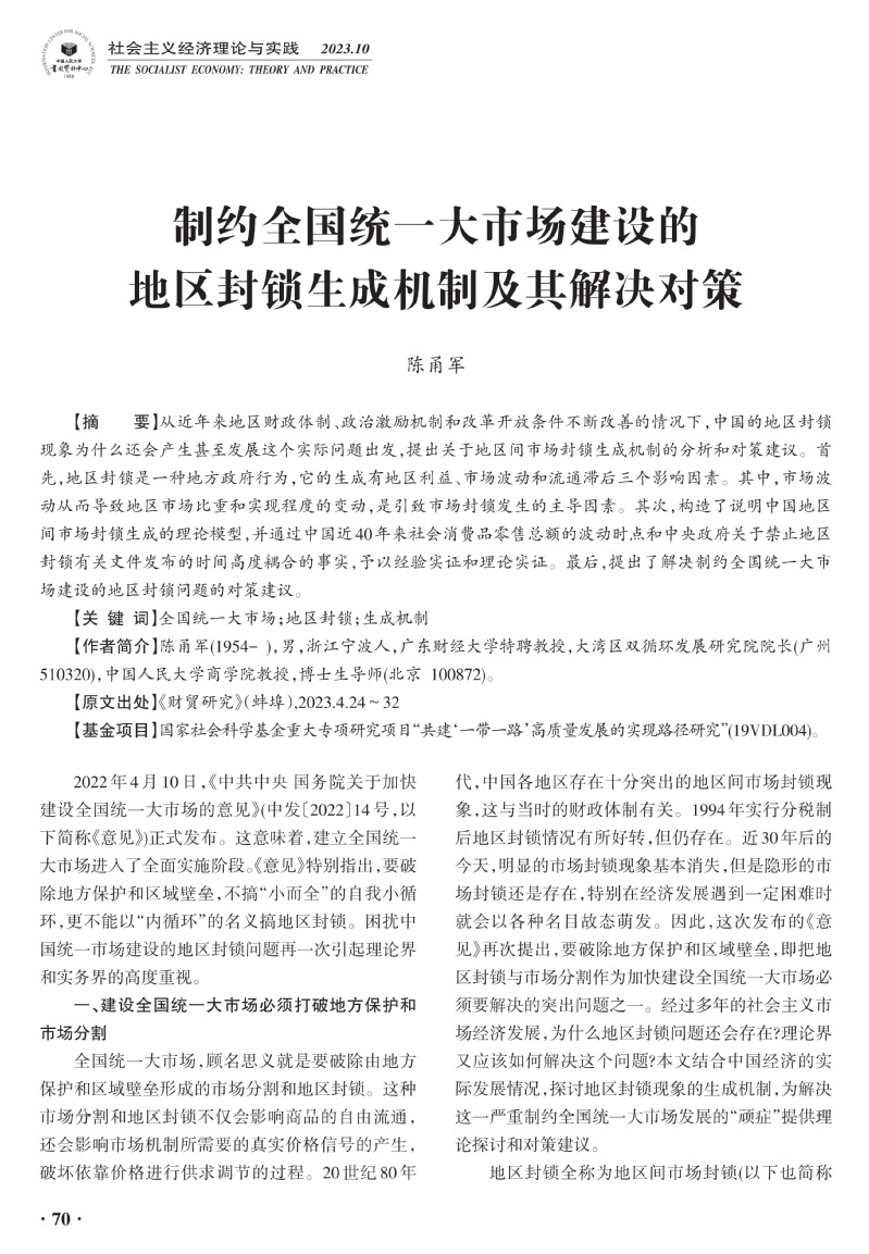 3. 陈甬军:制约全国统一大市场建设的地区封锁生成机制及其解决对策,原载于《财贸研究》,转载于2023年《社会主义经济理论与实践》专题10期。