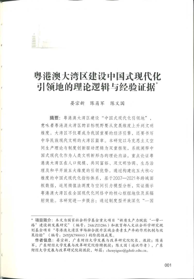 2026年1月,我院晏宗新、陈甬军、陈义国在《大湾区集刊》联合发表理论文章《粤港澳大湾区建设中国式现代化引领地的理论逻辑与经验证据》。