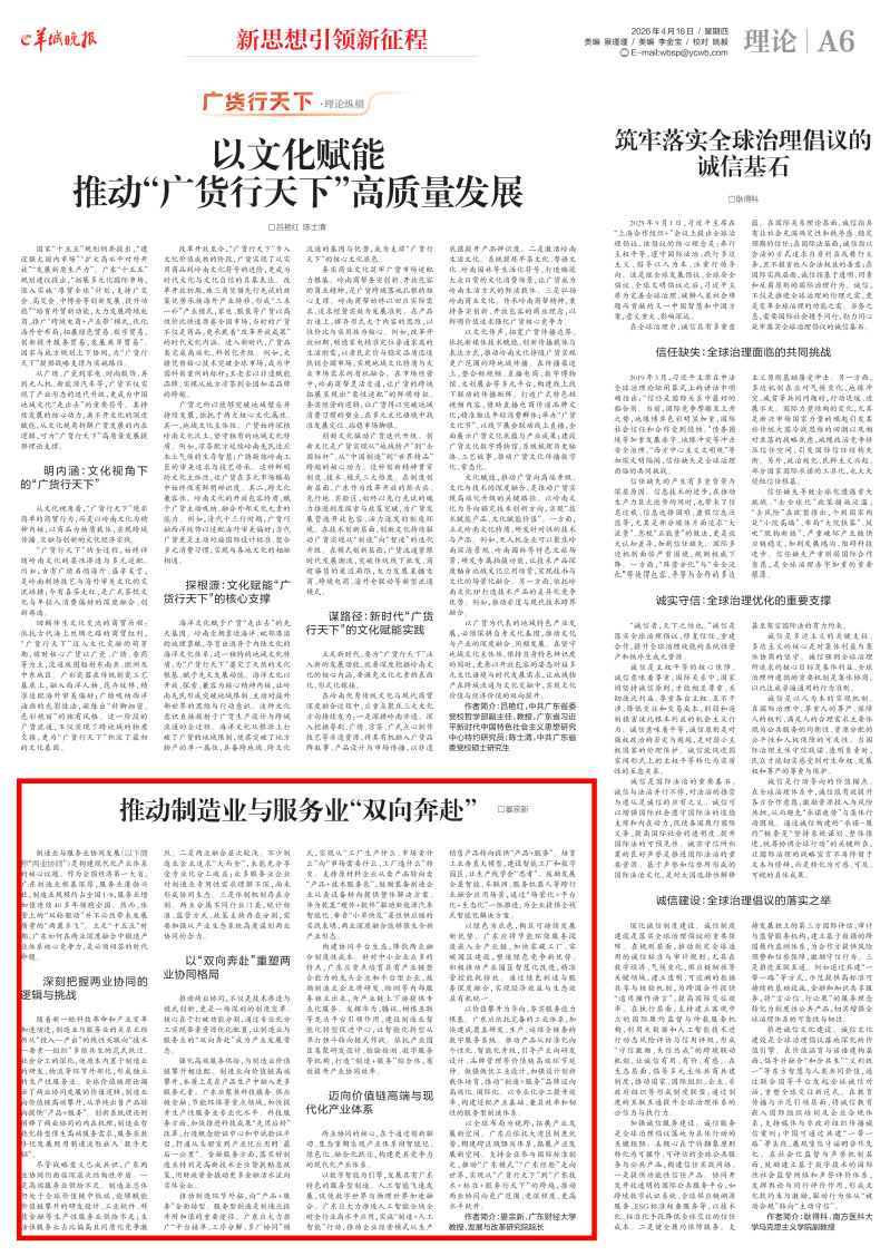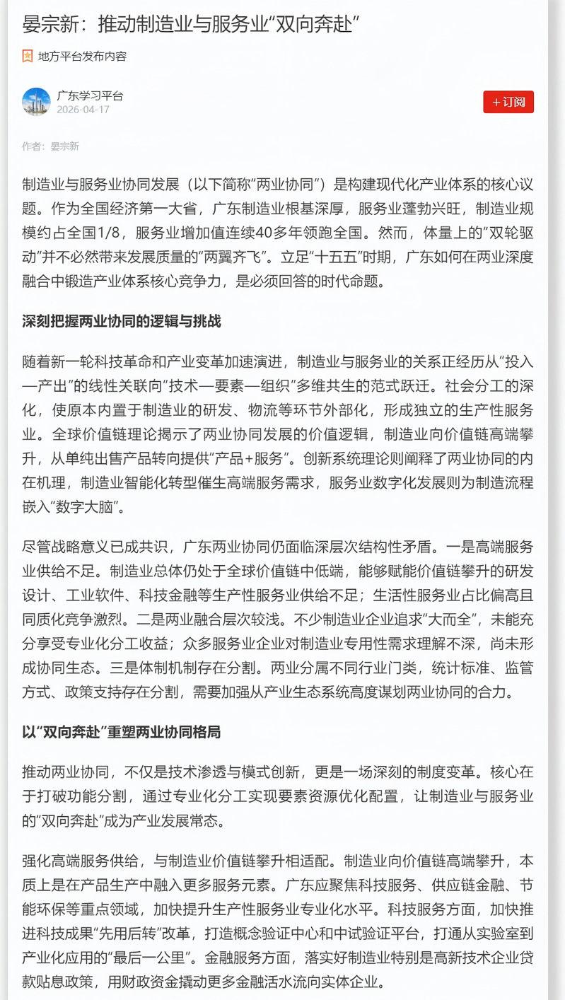 近日,我院院长晏宗新教授文章《推动制造业与服务业“双向奔赴”》于2026年4月16日、17日先后在《羊城晚报》、“学习强国”广东学习平台正式刊发。文章锚定“十五五”时期广东构建现代化产业体系的核心发展命题,系统梳理了制造业与服务业协同发展的底层逻辑与现实挑战,针对性提出两业“双向奔赴”的落地路径,为我省推动产业高质量发展、建设制造强省提供了兼具理论高度与实践指导性的智库视角专业参考。