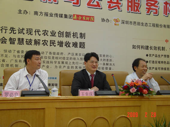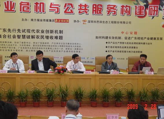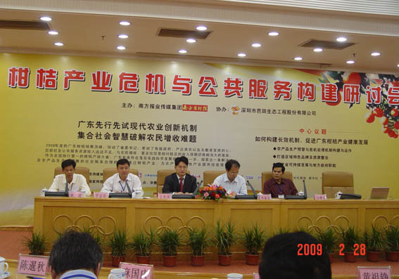 2009年2月28日,由南方报业传媒集团南方农村报主办的“柑桔产业危机与公共服务构建”研讨会在广州召开。本次研讨会共有150多名代表参会,包括省人大代表、省政协委员、政府官员、专家学者、柑桔协会负责人、经销商及果农代表。广东商学院流通经济研究所首席研究员徐印州教授、所长王先庆教授应邀出席了此次研讨会。