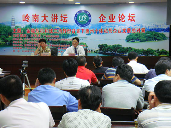 2009年5月21日,由中共广东省委宣传部、广东省社会科学界联合会主办,广东省私营企业协会承办,惠州市工商局、私营企业协会等单位协办的第15期“岭南大讲坛・企业论坛”在惠州市工商局会议室举行。广东商学院流通经济研究所所长、粤商研究中心主任王先庆教授应邀作了《金融危机和珠三角转型背景下惠州个体私营企业发展的对策》专题报告,惠州市各县(区)个体劳动者协会、私营企业协会有关负责人和民营企业主1000多人参加了讲座。