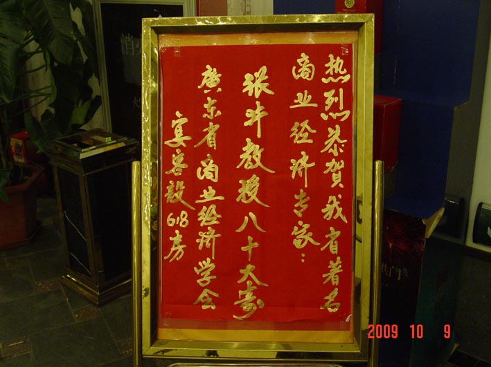 10月9日,广东著名商贸流通专家、原广东省财贸管理干部学院院长、原广东省商业经济学会会长张井教授80大寿。广东省商业经济学会秘书处为其举办了寿典,广东商学院党委书记程飚教授等省内部分商贸流通专家及张教授部分友人到场祝贺。广东省商业经济学会会长徐印州代表学会对张教授为广东商业经济研究及学会的发展做出的贡献表示赞赏和感谢,广东省商业经济学会秘书长王先庆教授代表秘书处向张井教授敬献了花篮。广东省政府发展研究中心副巡视员潘叙迭研究员特敬题字“厚德载福”。在寿典上,张教授对其自1949年以来的工作、生活、经历进行了介绍和评说,尤其是谈及自己30多年对广东商贸流通业观察与思考的心得感受,令在场宾客充满敬意。最后大家同祝张老健康长寿,并把商业研究和学会工作做得更好,以作为对老人家关爱的回报。