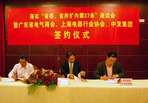 日前,由广东省电气商会为响应落实“省委、省政府扩内需决定”,实施“粤货全国行”计划,努力扩大内需市场,邀请政府有关部门、流通专家学者、金融单位、物流单位、行业企业、电子商务相关单位负责人在佛山制造基地举行《关于落实“省委、省府扩内需37条”座谈会》,共同讨论全面落实实施“粤货全国行”计划,与会代表围绕三个主要议题进行了发言:“如何推动流通企业建立国内销售网络;行业商会、协会就“扩内需”发挥重要作用,建议政府加大财政扶持力度。同时举行商会与上海电器行业协会、中发集团(上海机电城)签订“粤货全国行-上海展览会”战略合作协议,三方在上海机电城基础上拟建“上海(广货)小家电、灯饰照明、机电产品三个批发市场。