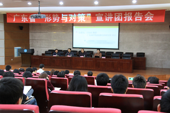 3月5日,2010年广东省“形势与对策”宣讲团首场报告会在广东商学院举行。作为“后金融危机时期广东经济社会发展的基本形势”专家宣讲团成员的广东商学院流通经济研究所所长王先庆教授在综合楼408为广大师生作了“后金融危机时期的广东:形势与对策”专题报告。副校长雍和明和来自华南师范大学、华南农业大学、广州市委党校等宣讲团的专家及省社科联科普办相关人员出席报告会。 会议由省社科联科普办主任白雄奋主持。