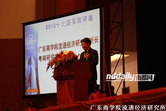 主持人:谢谢张总,这次的2010十大新粤商评选,南方报业传媒集团作为主办单位之一,积极献策献计,发挥媒体专长,有力保障了活动的顺利圆满举行。下面,我们有请广东商学院流通经济研究所所长、粤商研究中心主任王先庆先生为我们致辞。大家欢迎!