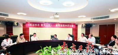 10月26日,“和谐感恩敢为人先”新粤商精神研讨会在南方日报举行,广东商学院流通经济研究所所长、粤商研究中心主任王先庆教授、省工商联副主席李阳春、省政府发展研究中心副主任汪一洋等13位专家学者、工商界负责人出席,研讨新粤商精神,为11月初即将召开的第二届新粤商大会预热,为新粤商更好地实现自身科学发展和推动广东经济发展方式转变献计献策。