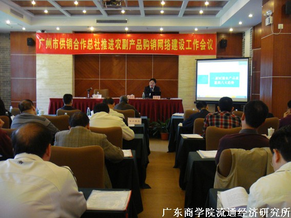 12月23-24日,广州市供销总社召开了推进农副产品购销网络建设工作会议,结合国务院40号文件精神和“十二五”规划建议,研究讨论了《广州市供销合作总社农产品购销网络建设方案(征求意见稿)》。 广东商学院流通经济研究所所长王先庆教授应邀给参会人员就新时期农产品流通的趋势、问题与对策作专题讲座。广州市供销总社党委书记、理事会主任喻自觉,副主任曾年,副巡视员冯淑桂,涉农企业、各区(县级市)供销联社及机关有关人员参加会议并听取了专题报告。