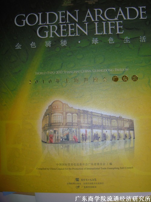 由广东省贸促会与广东教育出版社联合出版的《金色骑楼・绿色生活》7月份正式推出。  该画册被誉为“纸上广东馆”,详尽地展示和解读了广东馆三大展区的角角落落,读者不但如同身临其境地游览了一遍广东馆,更可一手掌握广东馆背后的文化和科技内涵。本书借解读世博广东馆为契机,让大家通晓传统―――如骑楼、潮州剪纸、十三行、香云纱这些岭南文化,又探讨未来―――广东经济由“制造”到“创造”的转型、中国第一个绿道网―――珠三角绿道网的建设……