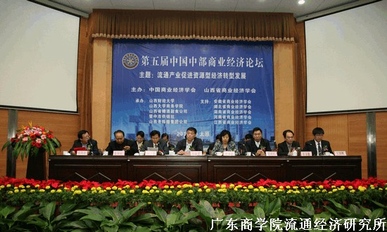 10月22日上午,由中国商业经济学会和山西省商业经济学会主办的第五届中国中部地区商业经济论坛在山西财经大学国际学术交流中心隆重举行。山西省政府副秘书长、省商务厅党组书记孙跃进,省社科联党组书记侯秀娟,中国商业经济学会副会长应志增以及中部六省商业经济学会的领导出席了开幕式。来自中部六省及北京、重庆、四川、广东、江苏、黑龙江等十余个省、市的二十余所高校,以及商贸流通企业界的百余名专家学者参加了论坛。广东商学院流通经济研究所所长王先庆教授应邀出席论坛并作了主题报告。
