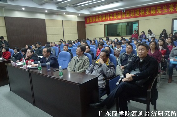 12月9日下午,香港利丰集团研究中心高级经理林至颖先生受聘广东商学院流通所研究员仪式在实验楼210隆重举行。整个议程由工商管理学院副院长兼广东商学院流通所研究员刘晓斌教授主持,聘书由工商管理学院院长兼广东商学院流通所研究员彭雷清教授颁发,工商管理学院部分老师和中联集团10位高层管理者出席了仪式,广商部分研究生和本科生参加了此次学术报告,座无虚席,后面的走廊上也站满热情的同学。