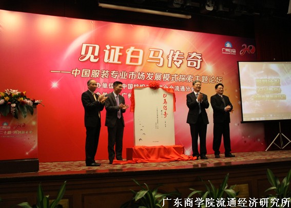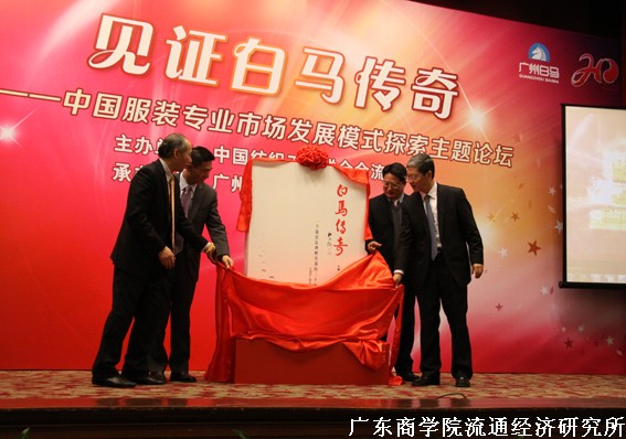 在论坛上举行了《白马传奇》一书的全国首发仪式。在《白马传奇》书中有王先庆教授撰写的文章《白马模式、白马效应与专业市场转型升级》。广州白马服装市场总经理程九洲、中国纺织工业联合会流通分会夏令敏会长、钱晋副会长及广东商学院王先庆教授共同为《白马传奇》新书隆重揭幕。