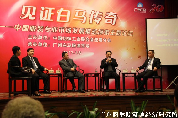 2013年1月8日,“见证白马传奇――中国服装专业市场发展模式探索”主题论坛在东方宾馆南国宴乐厅盛大举行。这是广州白马服装市场迎来开业二十周年举办的一系列庆祝活动之一。广东商学院流通经济研究所所长王先庆教授应邀出席论坛嘉宾。中国纺织工业联合会及流通分会领导、流通分会副会长单位、常务理事单位代表及政府、行业相关领导和资深专家逾150人出席了本次活动。