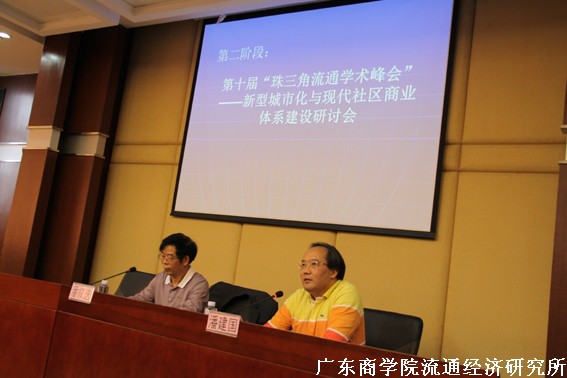 在新型城市化与现代化社区商业体系建设研讨会中,会议由潘叙迭主持,广百集团副总经理、博士潘建国、广东财经大学流通经济研究所所长王先庆、广东省商业经济学会会长徐印州、香港利丰集团华南区总裁林志颖分别作主题演讲。潘建国演讲题目是“试论社区专业店盈利模式的建设”、王先庆演讲题目是“体验式社区购物中心的特点与发展前景”、徐印州演讲题目是“社区商业与电子商务的发展”、林至颖博士演讲题目是“粤深港现代社区商业的新实践”。