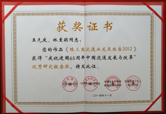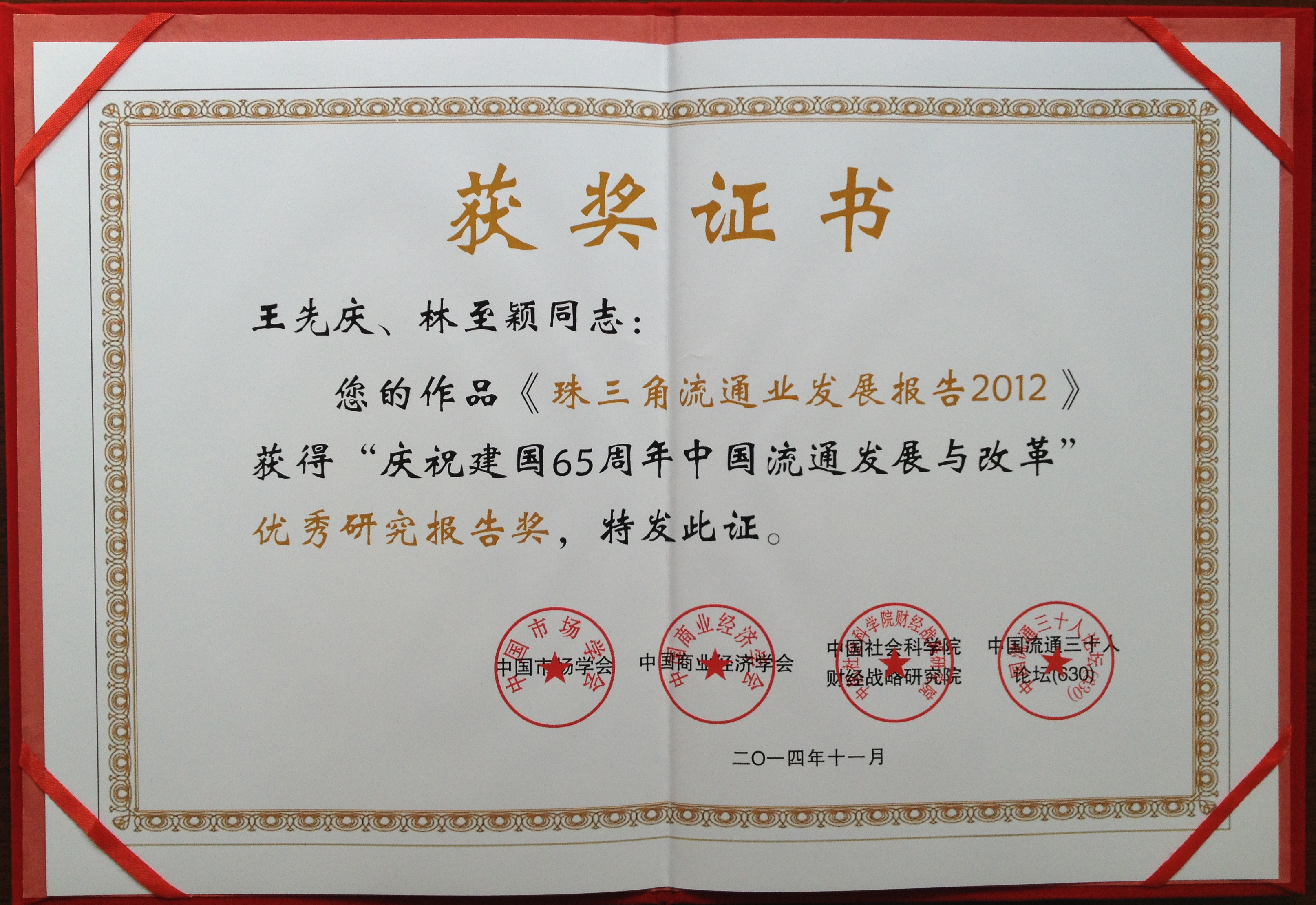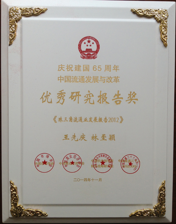 本次论坛评选了近五年来影响和推动中国流通领域改革发展的五大学术奖项:优秀著作奖、优秀教材奖、优秀论文奖、优秀研究报告奖和学术贡献奖。该奖项评选过程历经三个多月,评出了20篇(部)获奖学术成果和一个获奖单位。与会专家在现场为获奖者颁发了奖牌和证书。其中由广东财经大学流通经济研究所所长王先庆、林至颖主编的《珠三角流通业发展报告2012》获“庆祝建国65周年中国流通发展与改革”优秀研究报告奖。《珠三角流通业发展报告2012》2012年8月由社会科学文献出版社出版。
