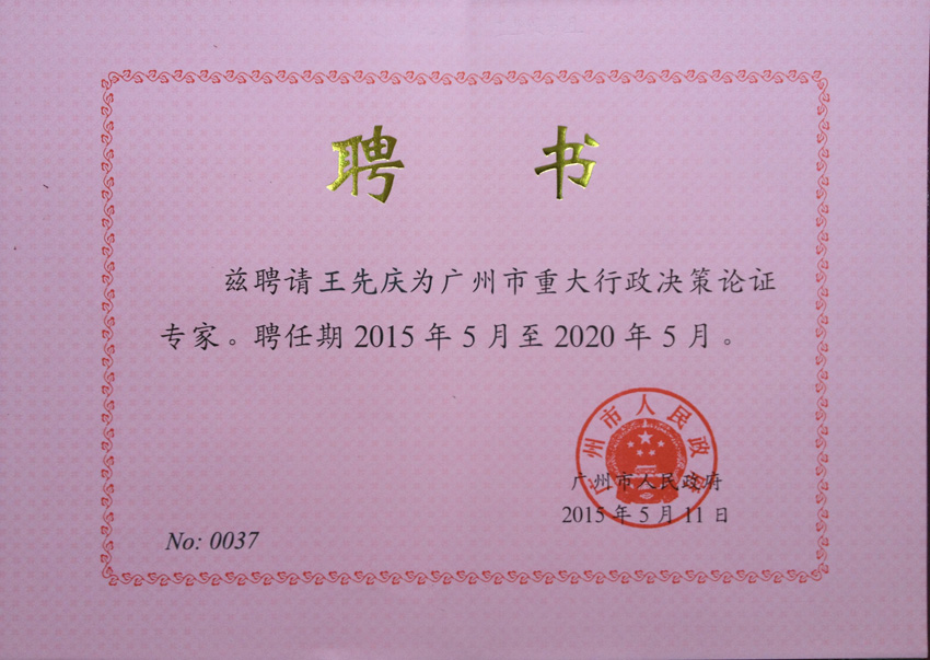2015年5月19日,广州市人民政府研究室文件(穗府研字【2015】5号)发文:经市人民政府同意,广州市重大行政决策论证专家库正式成立并启用。请按《广州市重大行政决策专家论证办法》(穗府办〔2014〕13号)及《广州市重大行政决策论证专家库管理工作细则》(穗府研字〔2014〕11号)认真贯彻实施。