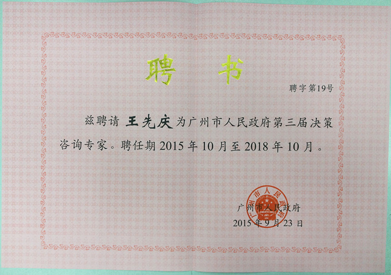 根据《关于聘任广州市人民政府第三届决策咨询专家的通知》(穗府研字【20157号),广东财经大学杜承铭教授、流通经济研究所所长王先庆教授获聘为广州市人民政府第三届决策咨询专家。其中,王先庆获聘为产业经济和科技创新决策咨询组专家,杜承铭获聘为市场服务和管理决策咨询组专家。聘任期为201510月至201810月。