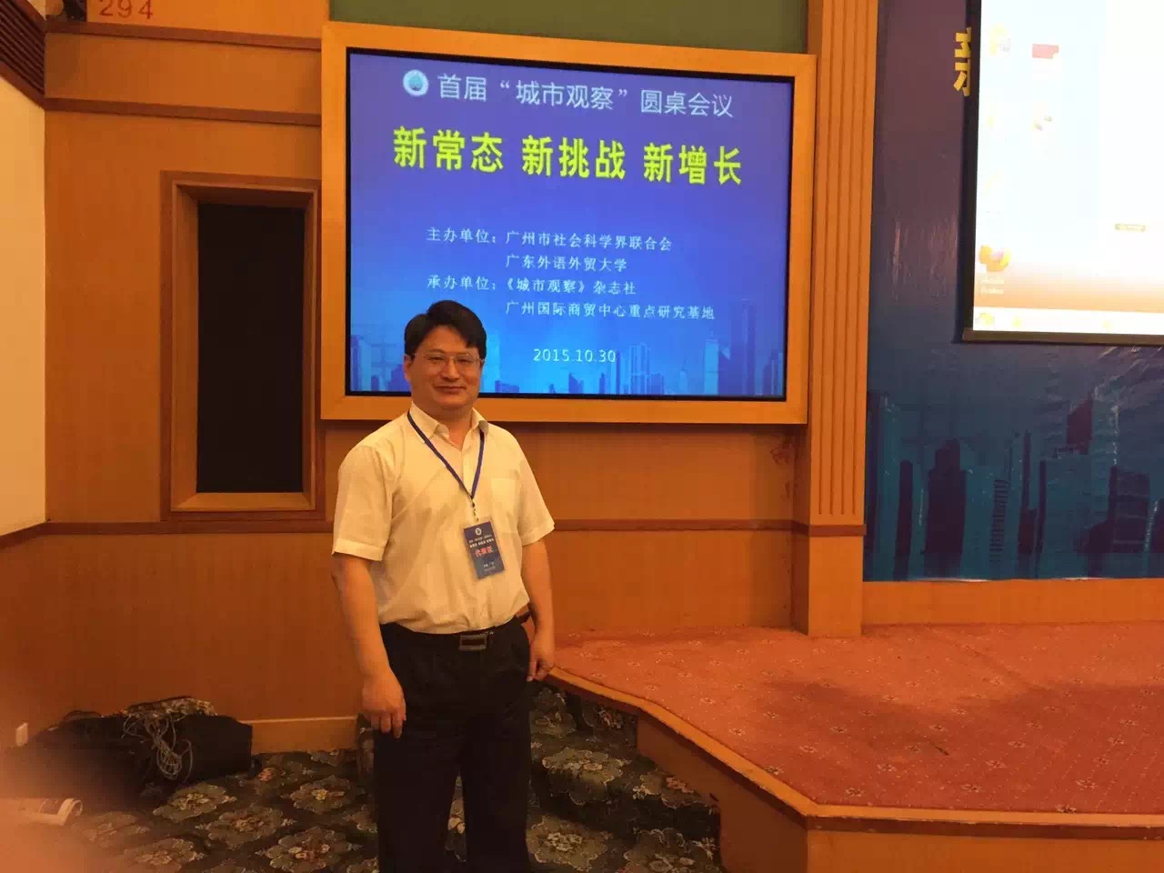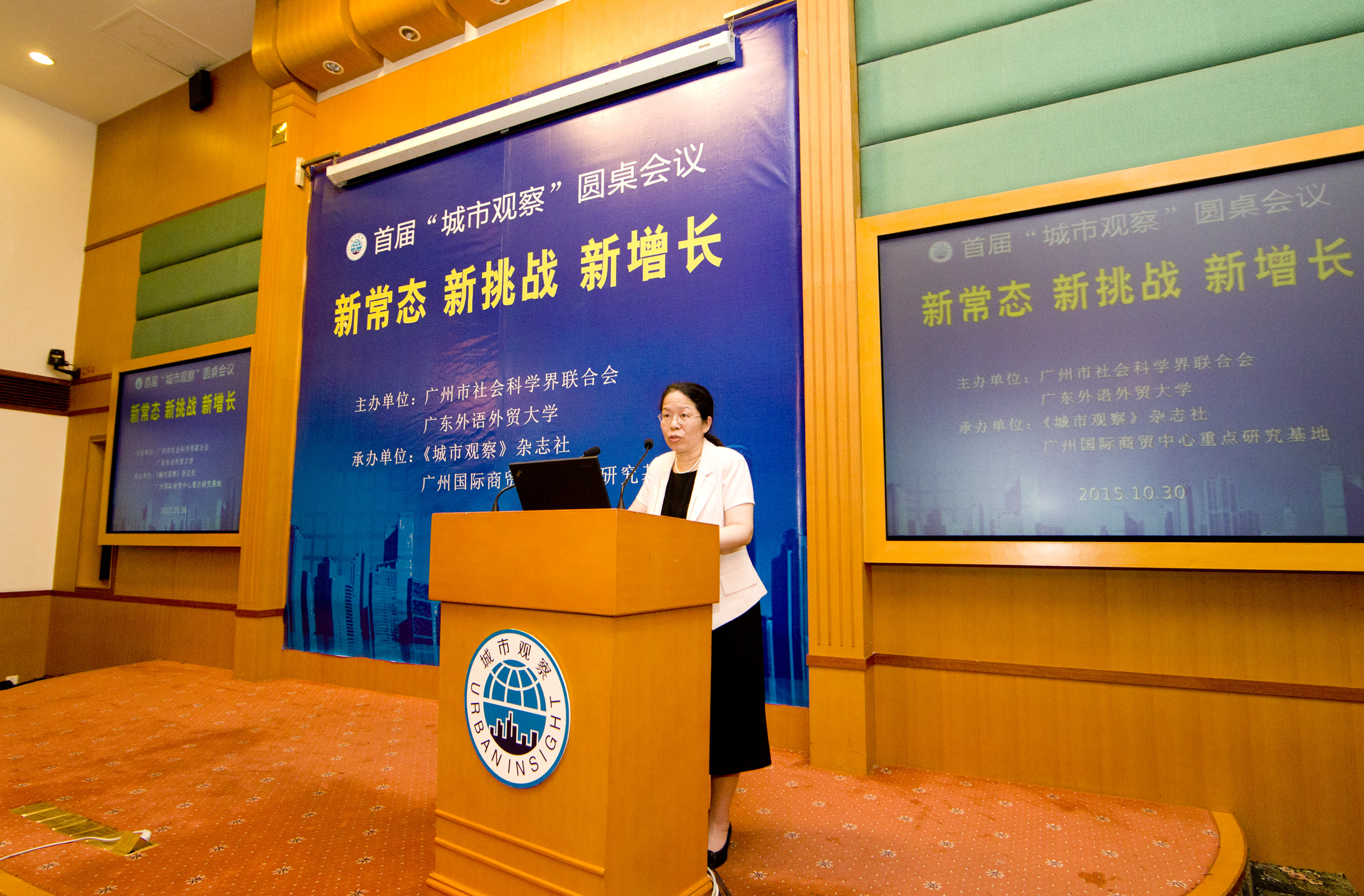 2015年10月30日,由广州市社会科学界联合会、广东外语外贸大学联合主办的首届“城市观察”圆桌会议――“新常态・新挑战・新增长”暨学习贯彻十八届五中全会精神会议在广东外语外贸大学行政楼举行,