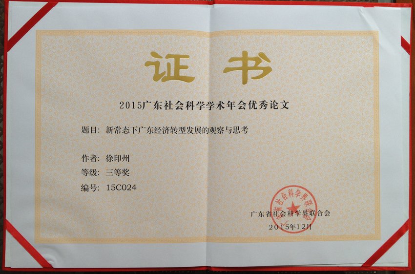 2015广东社会科学学术年会共设14个专场,收到论文约900篇,创历史新高,共评出优秀论文283篇。广东财经大学流通经济研究所首席研究员徐印州教授的《新常态下广东经济转型发展的观察与思考》荣获2015广东社会科学学术年会优秀论文三等奖。
