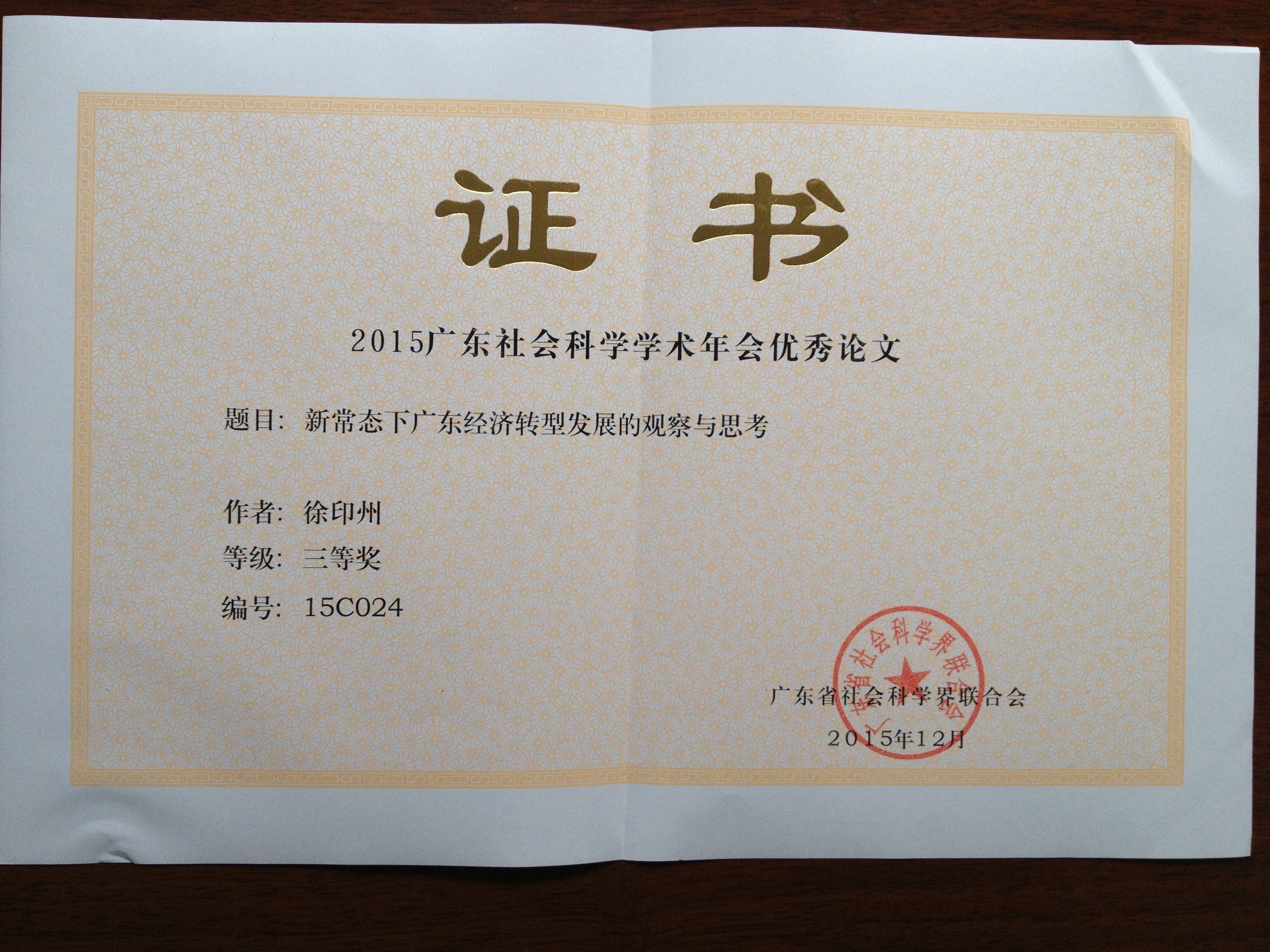 2015广东社会科学学术年会共设14个专场,收到论文约900篇,创历史新高,共评出优秀论文283篇。广东财经大学流通经济研究所首席研究员徐印州教授的《新常态下广东经济转型发展的观察与思考》荣获2015广东社会科学学术年会优秀论文三等奖。