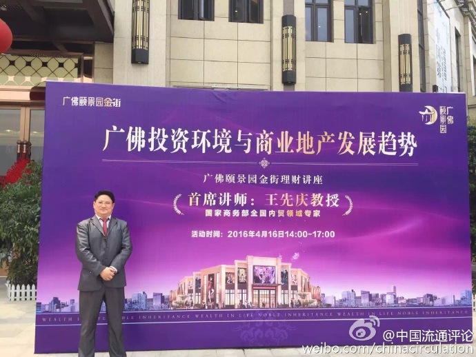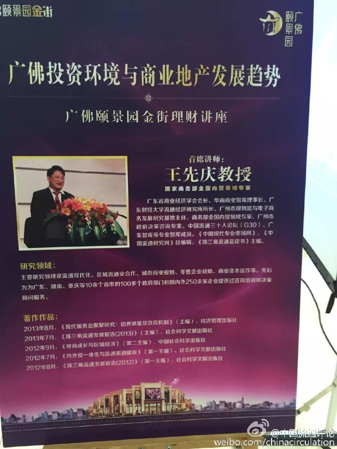 4月16日,广东财经大学流通经济研究所所长王先庆应邀在广佛颐景园进行专题演讲,他演讲的题目是:广佛投资环境与商业地产发展趋势。