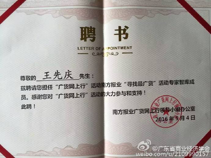 由广东省人民政府主办、广东省商务厅承办的广货网上行活动,自2012年以来,至今已连续举办四年。今年的“寻找最广货”活动更组建了最强专家库,对产品进行评测,务求找到最具时代性、最具代表性的新广货。5月5日,由南方都市报举办“寻找最广货”项目专家研讨会在广州举行,同时“广货网上行”之“寻找最广货”活动专家库正式宣告成立。商务部经贸政策咨询委员会专家、广东省商业经济学会会长、广东财经大学流通经济研究所所长王先庆受聘“广货网上行”活动南方报业“寻找最广货”活动专家智库成员。