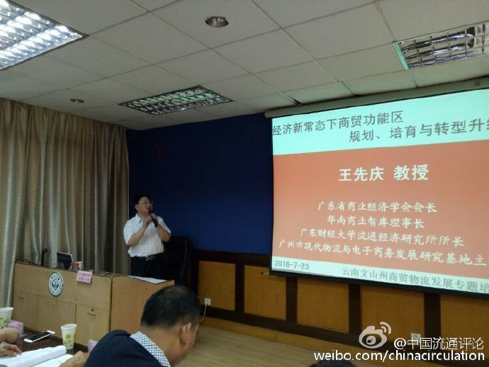 2016年7月23日,云南文山州商贸物流发展专题培训班在中山大学举行,广东财经大学流通经济研究所所长王先庆应邀为学员授课,王先庆主讲的主题是经济新常态下商贸功能区的规划、培育与转型升级,云南文山州商务主管部门领导及州、县(市)商务和物流园区领导干部、物流企业负责人等50余人参加了培训。