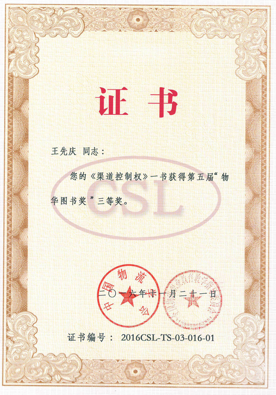 中国物流学术年会和全国物流职业教育教学指导委员会在2016年11月26日召开的“第十五次中国物流学术年会”大会上,表彰了第五届“物华图书奖”,广东财经大学流通经济研究所所长王先庆教授专著《渠道控制权》荣获三等奖。