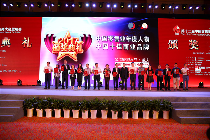 2017年5月24日,由中国商业联合会与与中国商报社联合主办、中国商报社承办的“2016-2017(第十二届)中国零售业年度人物”和“2017中国十佳商业品牌”评选结果在中国零售商大会上隆重揭晓。重庆市人民政府副市长刘桂平,原商业部副部长、中国商业联合会原会长何济海,十一届全国政协经济委员会副主任、商务部原副部长、中国商业联合会原会长张志刚,中国商业联合会会长姜明、常务副会长王民、副会长傅龙成、张丽君、党委副书记周京英、监事长田莉,重庆市商务委员会主任熊雪、副主任熊林等领导莅临开幕式。商务部流通业发展司副司长尹虹、市场秩序司副处长郑文渊也出席大会。来自全国的各业态零售商、服务商、供应商以及各级政府部门、协会代表近2000位,汇聚重庆,共商发展。