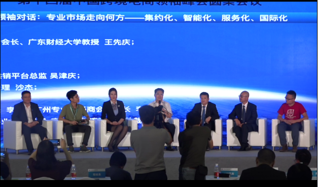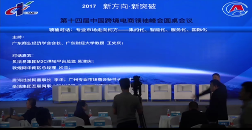 第十四届中国跨境电商领袖峰会圆桌会议10月12日下午在保利世贸博览馆举行。来自阿里巴巴、敦煌网、广贸、广州专业市场公共服务平台、圣地、震海、新濠畔等平台的专家都作了精彩发言。期间还进行了专题对话,对话的主题是“专业市场走向何方――集约化、智能化、服务化、国际化”,由广东省商业经济学会会长、广东财经大学流通经济研究所所长王先庆教授担任主持,