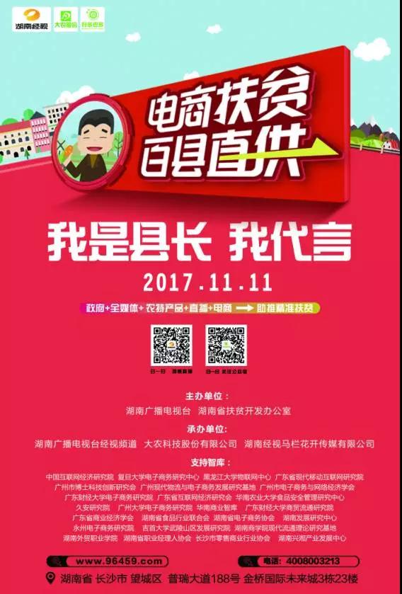 为践行习近平总书记扶贫开发重要战略思想,坚决贯彻党中央、国务院脱贫攻坚决策部署,确保2020年所有贫困人口迈入小康。2017年11月11日,第二届大型公益扶贫活动一一《我是县长我代言》24小时网络直播将在湖南长沙举行。