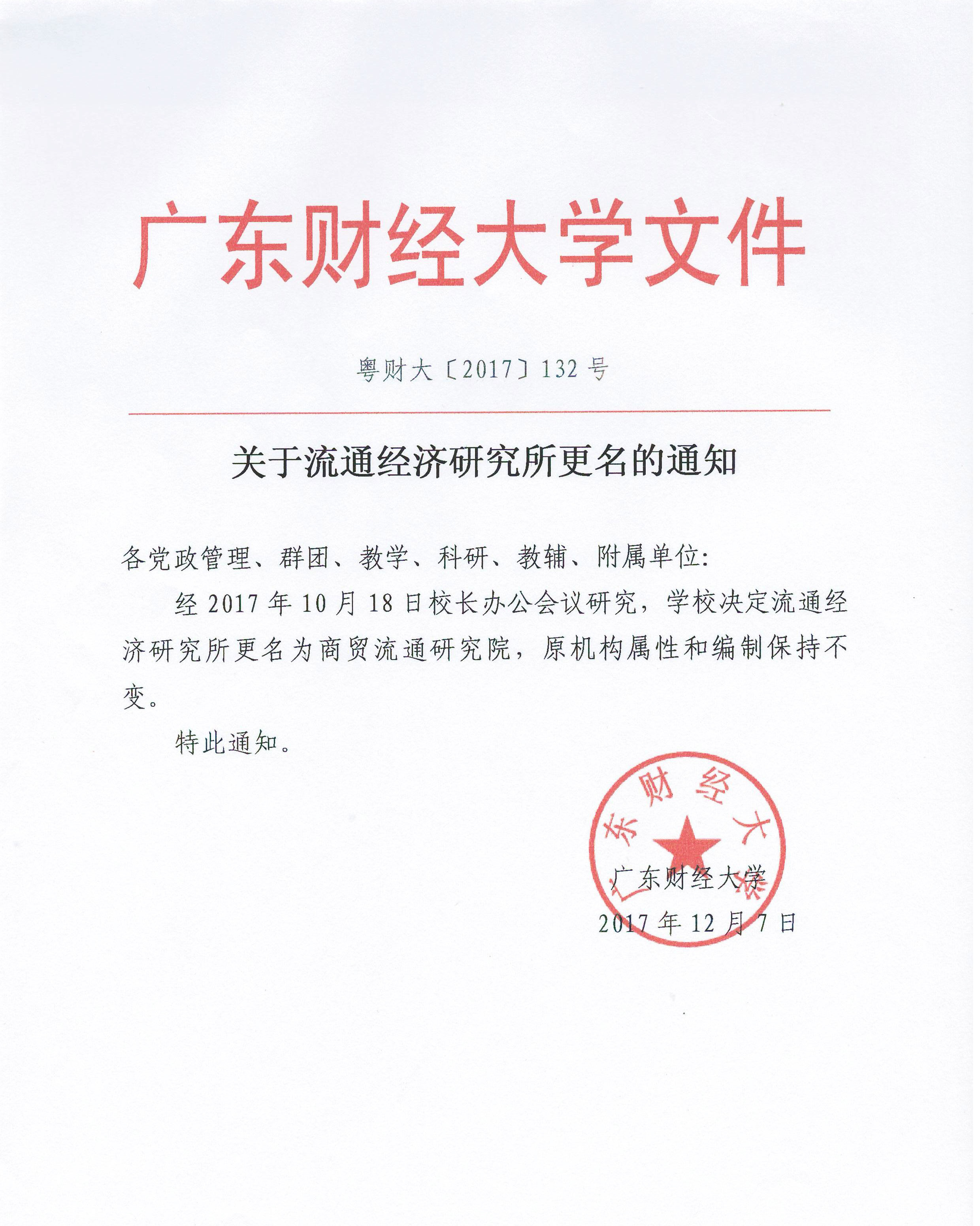 2017年12月8日,学校正式发文,广东财经大学流通经济研究所从2017年10月18日起,正式更名为“广东财经大学商贸流通研究院”。广东财经大学的商贸流通研究,也在十九大召开那一天,迎来了新时代。从2002年的“市场战略研究中心”到2005年更名“流通经济研究所”,再到今天的“商贸流通研究院”,一路走来,得到了各界朋友的关注和支持。院长王先庆衷心感谢大家,更希望大家大家一如既往地继续多鼓励、多支持、多关心指导。