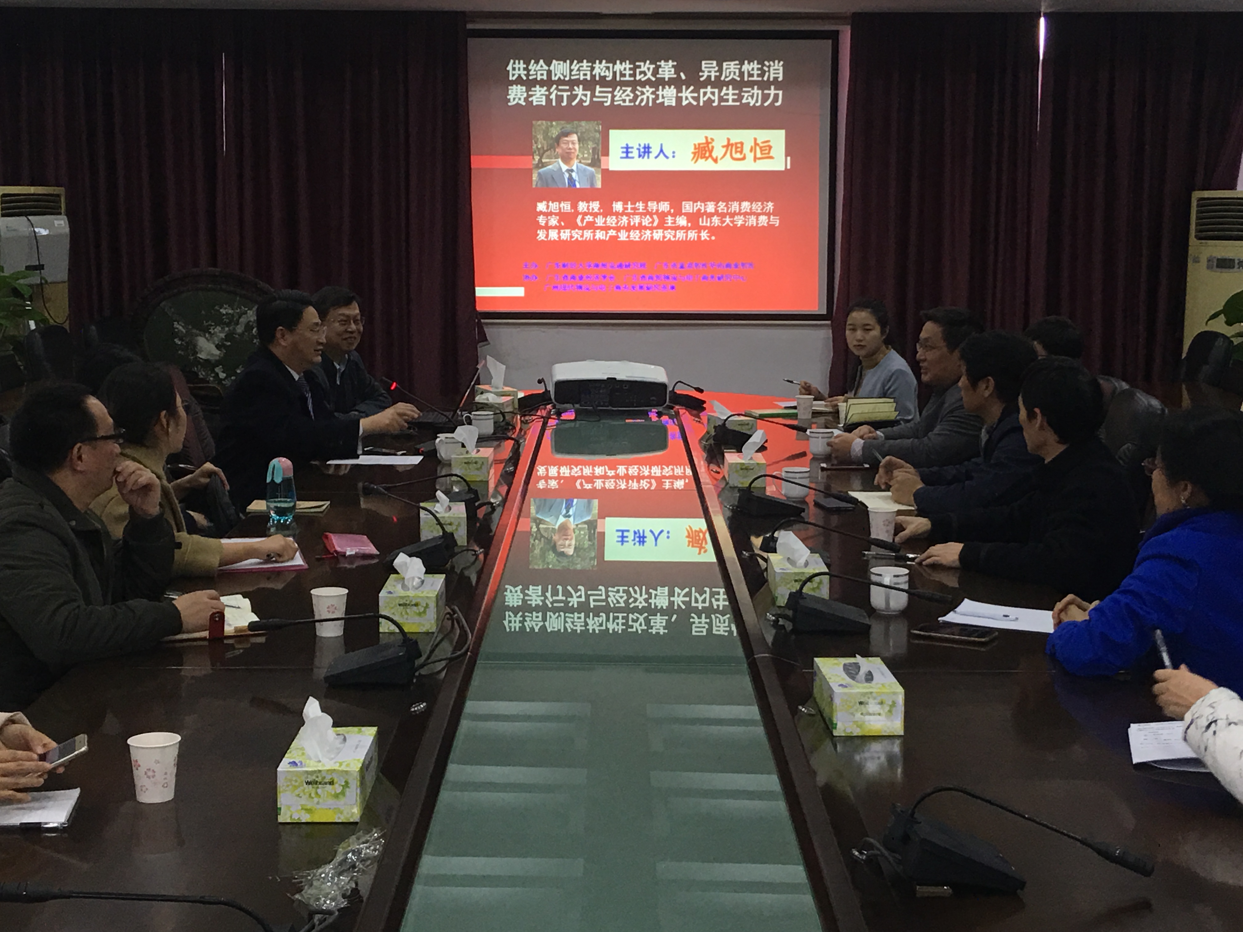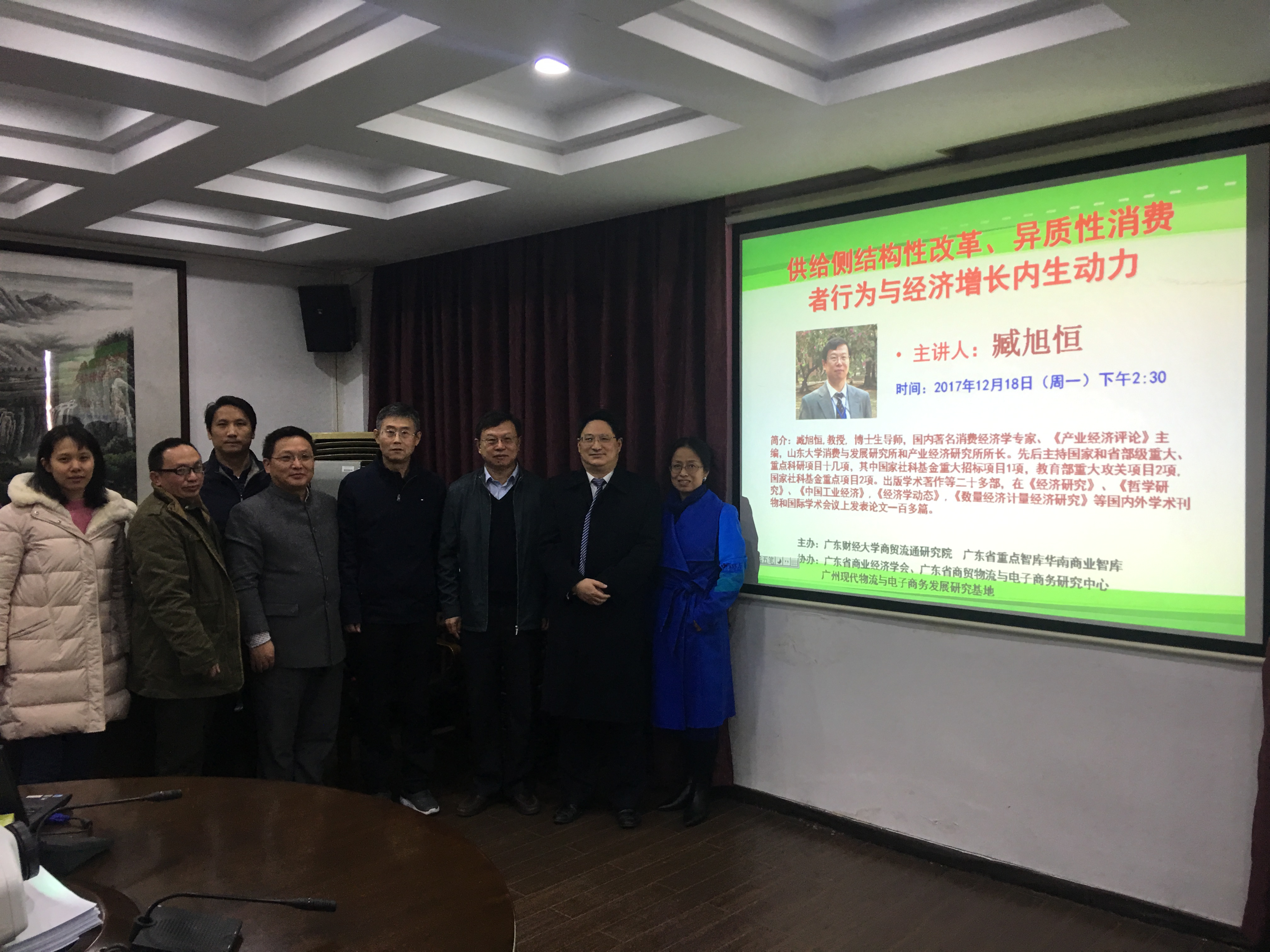2017年12月18日,臧教授应广东财经大学商贸流通研究院院长王先庆教授邀请,发表题为“供给侧结构性改革、异质性消费者行为与经济增长内生动力”的主题演讲,来自中山大学、广东财经大学等单位的30多位专家与研究人员参加了此次讲座。