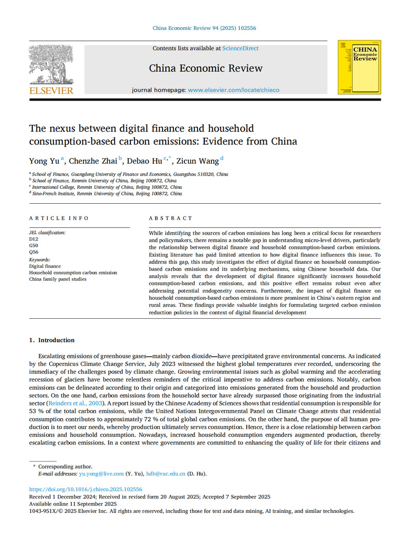 胡德宝:The nexus between digital finance and household consumption-based carbon emissions: Evidence from China